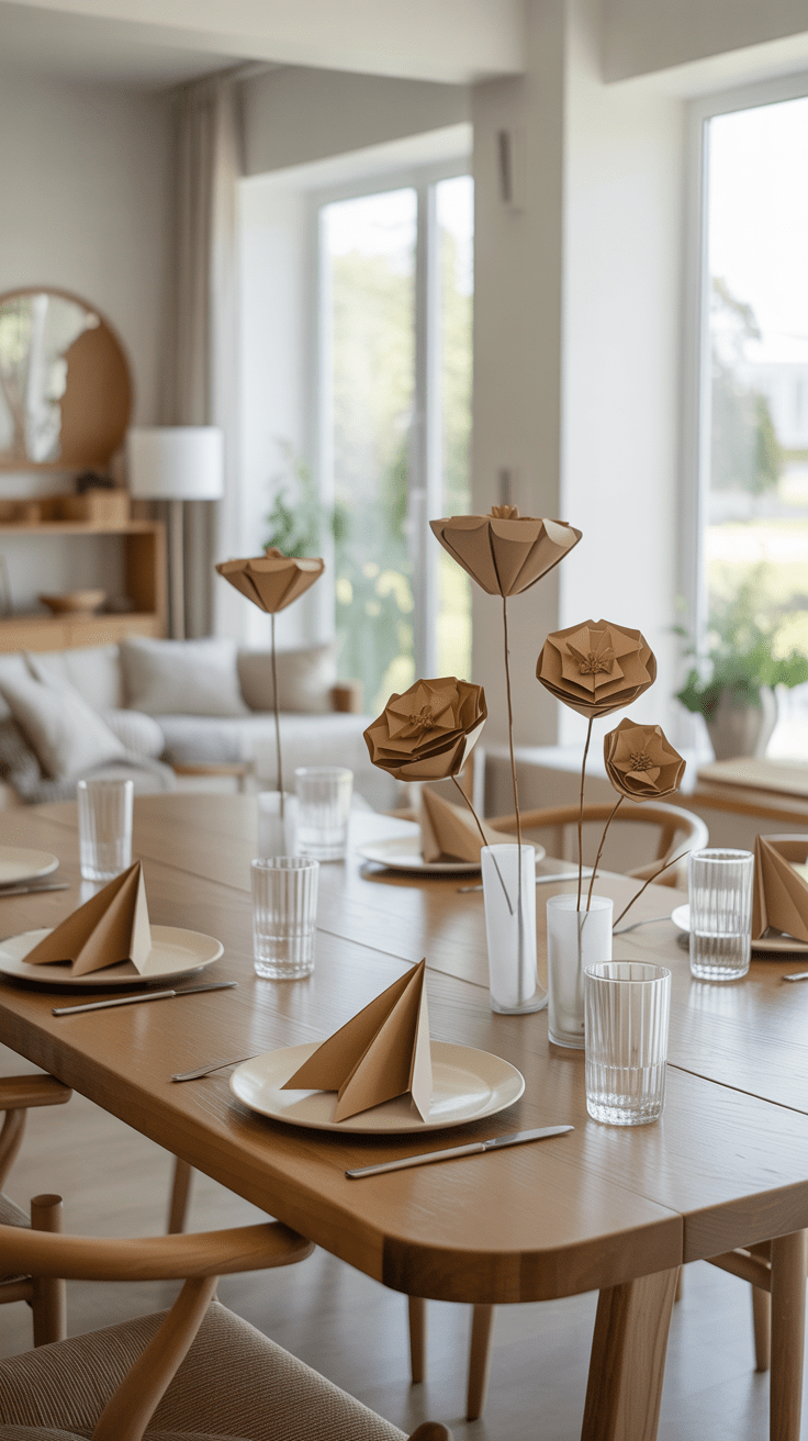 Aus naturfarbenem Kraftpapier lassen sich filigrane Blüten falten, die gleichzeitig als Platzkarten dienen. Sie bringen eine zarte Struktur in die Tischlandschaft und greifen das Thema Naturpapier auf. Jeder Gast findet so seinen Platz mit einer persönlichen Note. Papierblüten wirken leicht und verleihen der Dekoration eine handwerkliche Ästhetik.