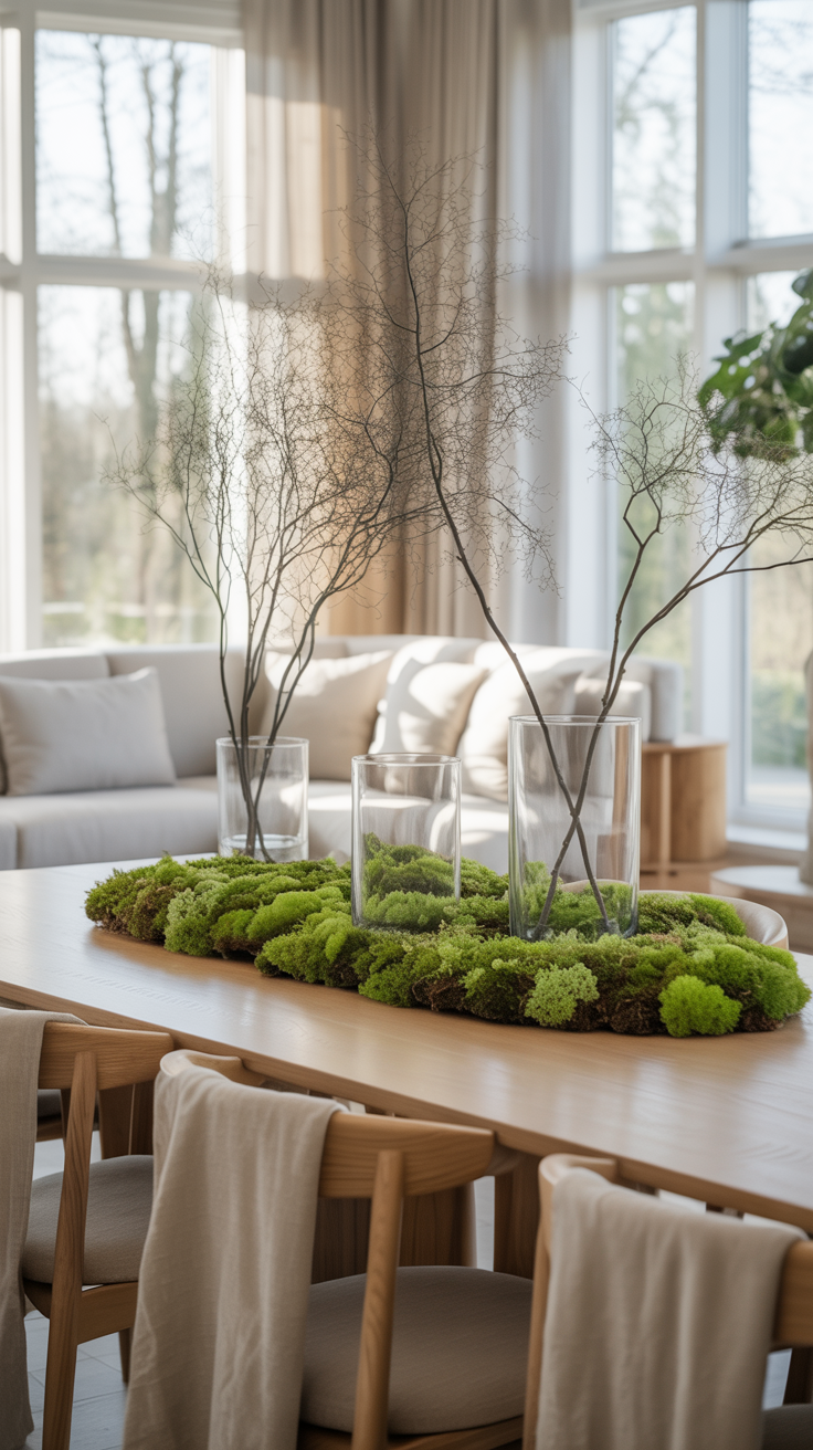 Fülle einzelne Glaszylinder oder -kuben mit einer Moosschicht und setze sie gruppenweise in der Tischmitte auf. Du kannst zusätzlich ein oder zwei zarte Zweige hineinstecken, um die Höhe zu variieren. In der Gruppe entfalten sie ihre volle Wirkung als kleines Waldensemble.