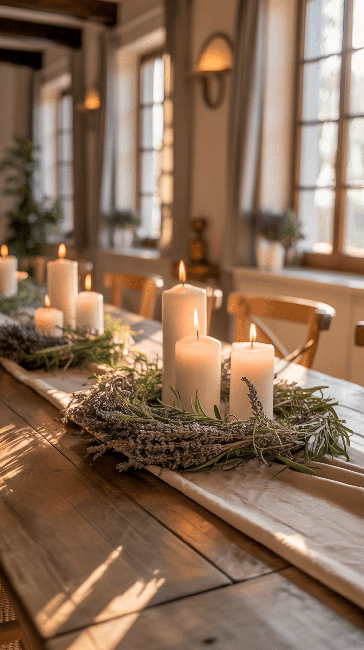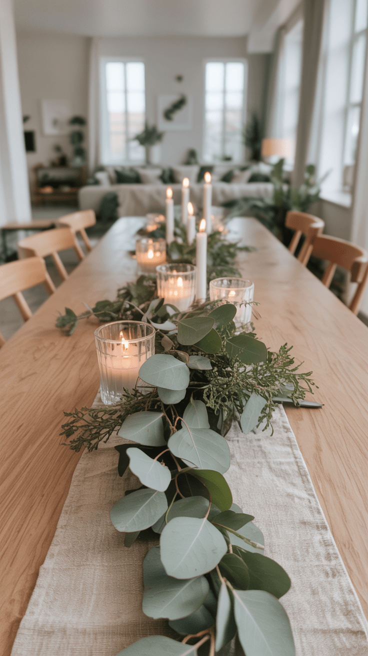Wickle einzelne Zweige zu einer langen Kordel oder verbinde sie mit feinem Draht. Lege die Girlande locker auf den Tisch und ergänze sie mit Kerzen in Glasbehältern. So entsteht ein leichtes, elegantes Band, das den Blick entlang der Tafel leitet.