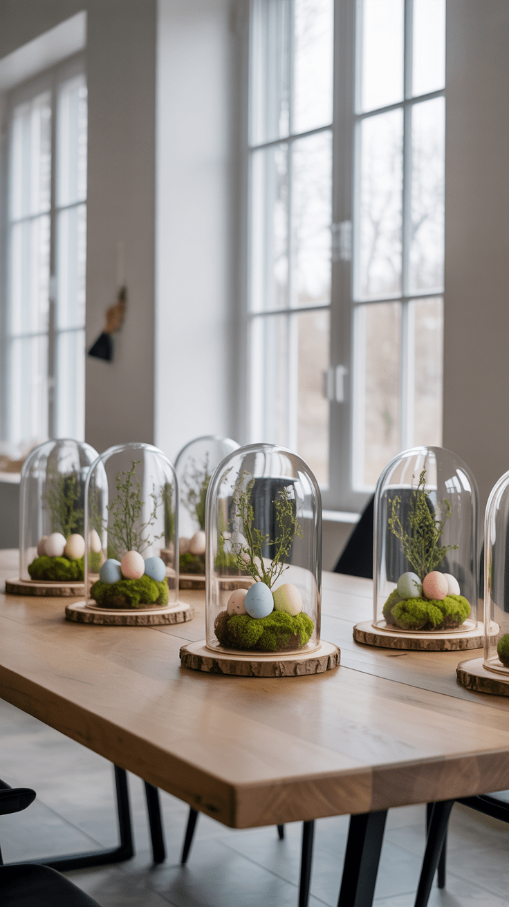 Suche nach kleinen Glasglocken, die du auf eine Unterlage setzt. Drücke etwas Moos hinein und platziere das Ei darauf. Variiere die Größe der Glocken und gruppiere sie als stille Objekte entlang deiner Tischmitte. So entsteht eine feine Landschaft in Miniatur.