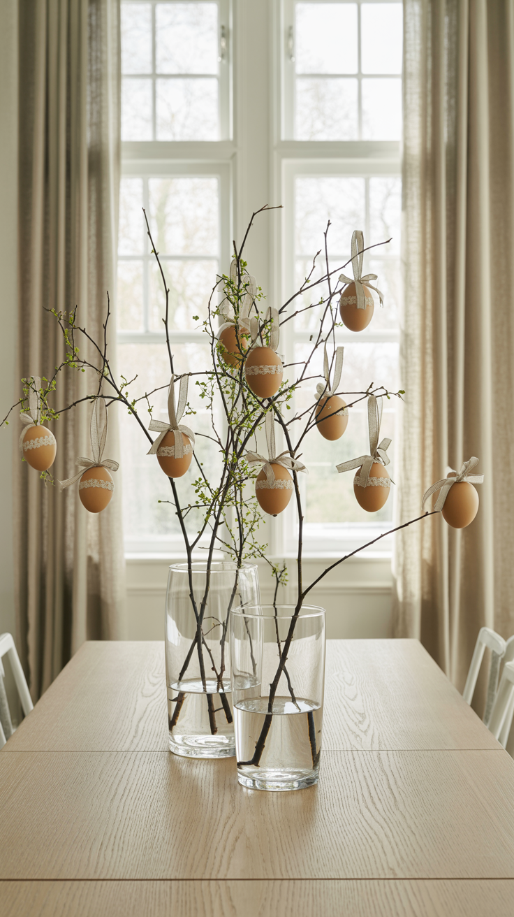 Um das Projekt umzusetzen, sammelst du einige Birkenzweige aus dem Garten oder Wald und schneidest sie behutsam zurecht. Wähle schlichte Glasvasen in unterschiedlichen Höhen und verteile die Zweige so, dass sie sich leicht überlappen. Befestige deine Eier mit feinem Leinenband an den Zweigen und setze die Vasen als gruppiertes Ensemble auf den Tisch.
