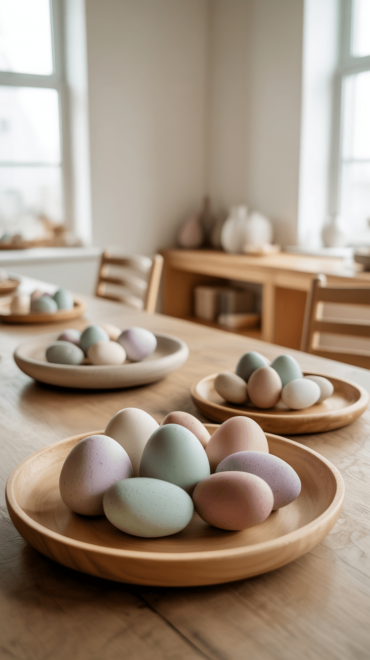 - Eier in sanften Naturtönen oder gedämpften Pastellfarben.