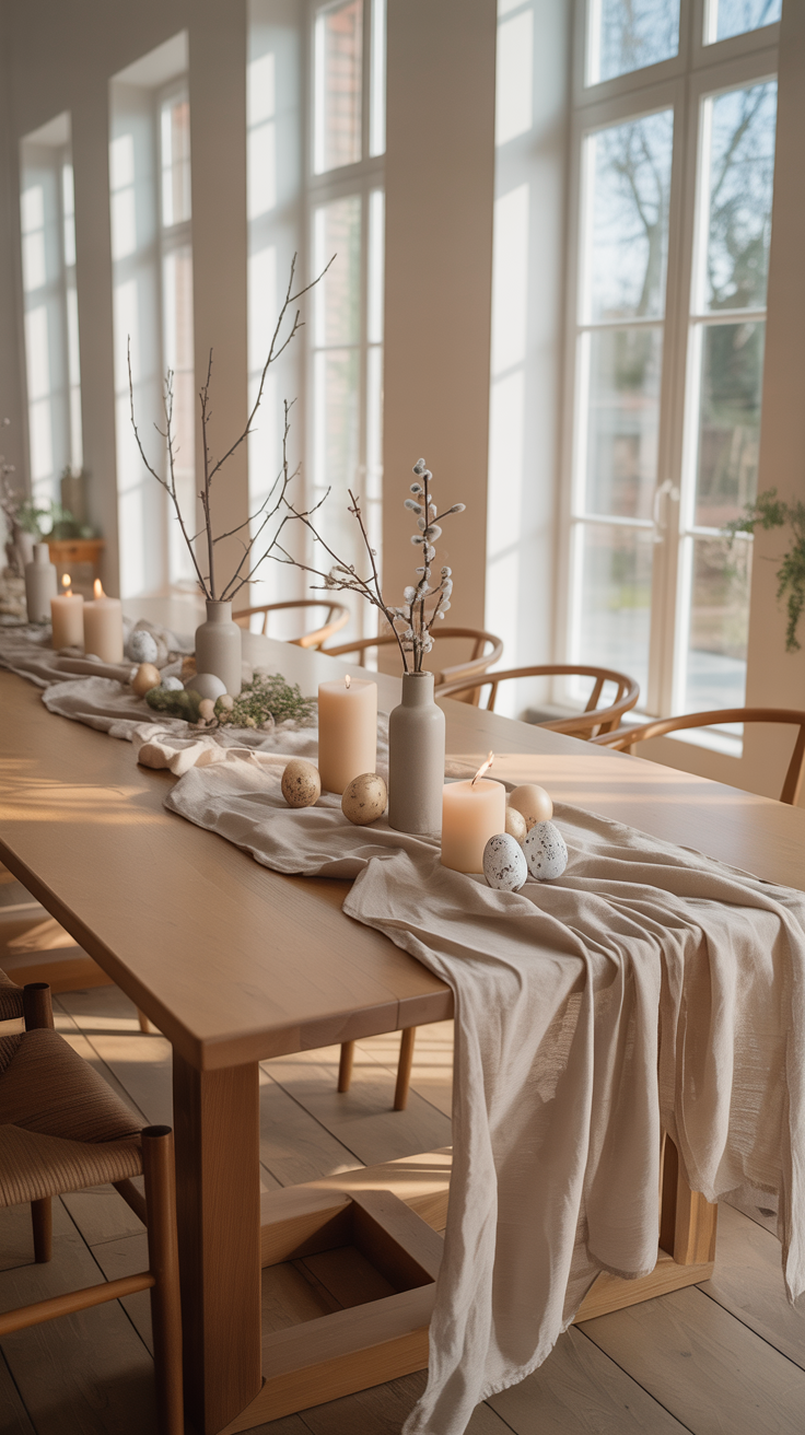 Dieses Arrangement funktioniert, weil die Birkenrinde eine helle, sanfte Maserung bietet, die perfekt zu den gedeckten Naturfarben der Eier harmoniert. Die vertikale Ausrichtung der Zweige setzt einen feinen Kontrast zur horizontalen Tischfläche und bringt Dynamik ins Gesamtbild. Zugleich bleibt die Komposition luftig und überschattet nicht die übrige Dekoration.