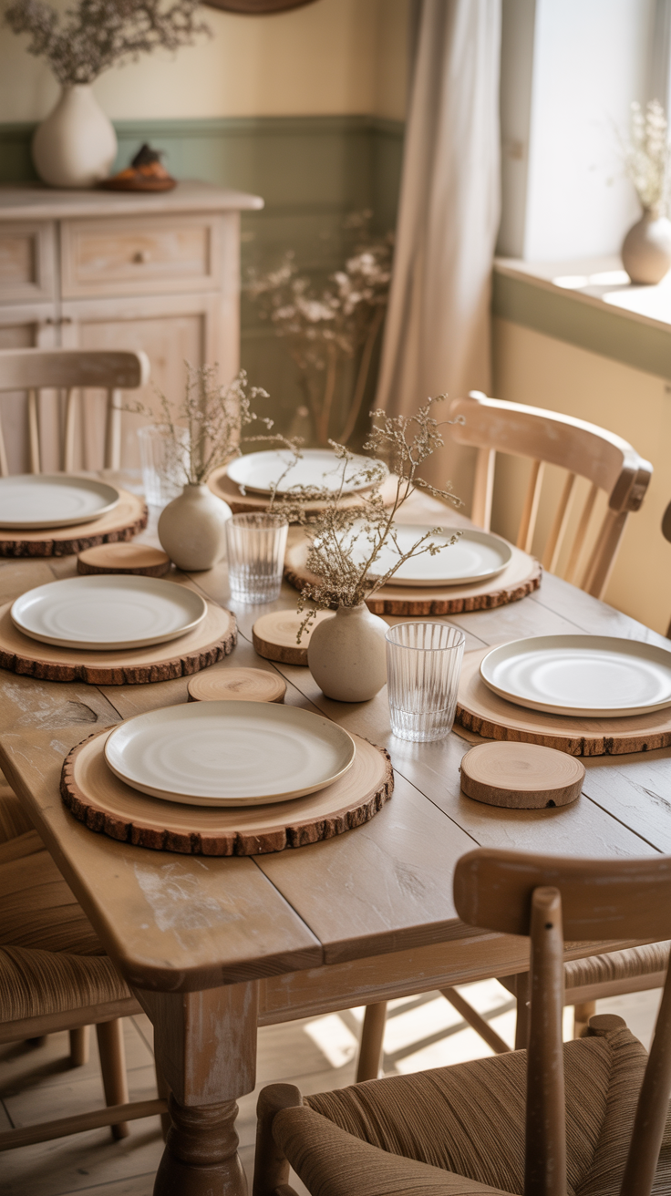 Lege die Holzscheiben einzeln vor jeden Platz und platziere deinen Lieblingsspeiseteller darauf. Ergänze das Arrangement mit einem kleinen Zweig oder einer getrockneten Blüte direkt auf dem Teller. So schaffst du ein einladendes Setting, das sofort zum Platznehmen auffordert.