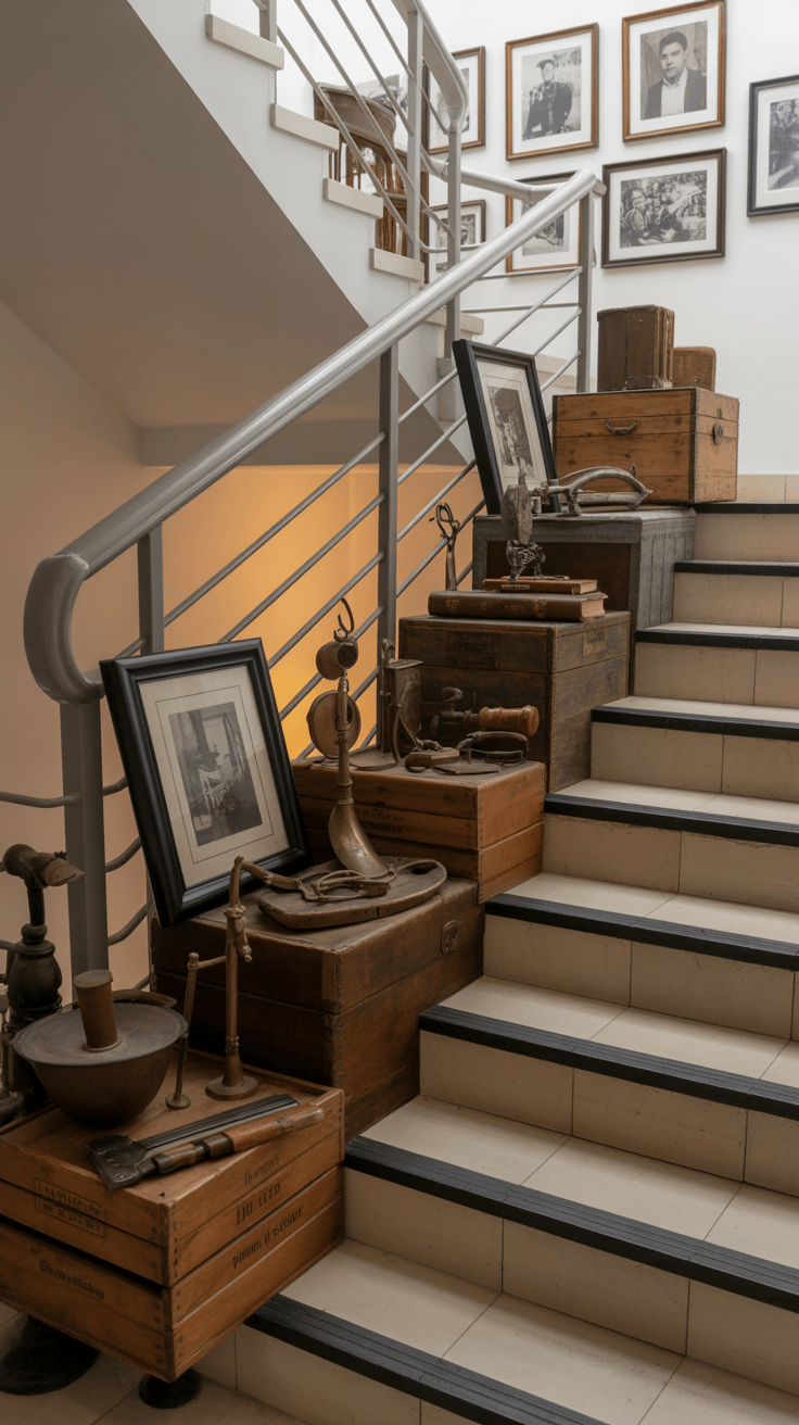 Einzelne Antikstücke oder Flohmarktfunde machen dein Treppenhaus besonders charaktervoll. Alte Holzkisten, alte Werkzeuge oder gerahmte Fundstücke erzählen ihre eigene Geschichte. Sie wirken wie kleine Zeitzeugen an jeder Stufe.