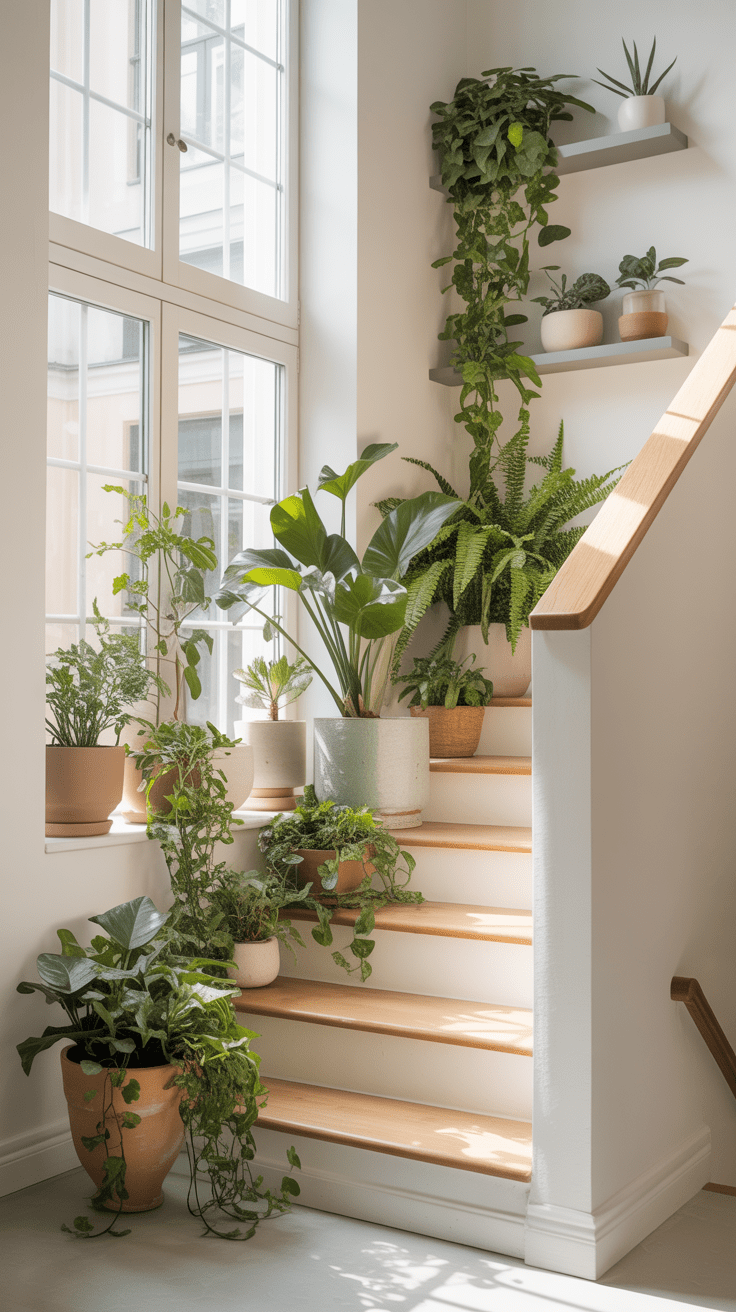 Die lebendige Struktur der Blätter kontrastiert sanft zur klaren Linienführung der Treppe. Pflanzen reinigen die Luft und bringen unterschiedliche Höhen in die Architektur. Damit bleibt das Treppenhaus luftig und zugleich üppig belebend.