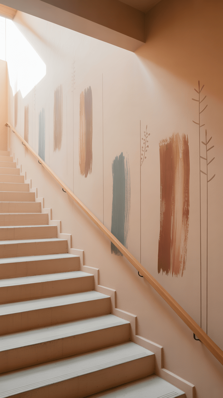 Die direkte Maltechnik verleiht deinem Treppenhaus eine persönliche Note und erzählt von Kreativität. Durch den manuellen Prozess entstehen leichte Unregelmäßigkeiten, die Authentizität ausstrahlen. Eine einfarbige Basiswand lässt die Muster besonders wirken.