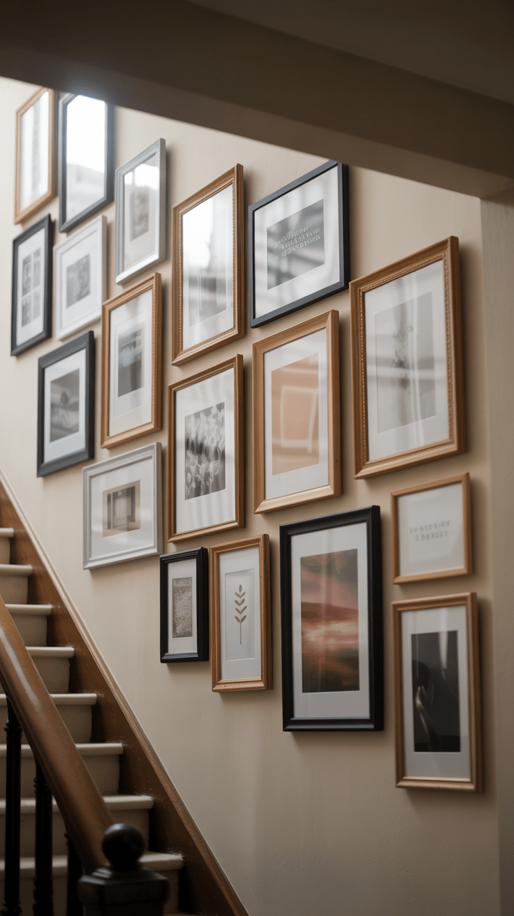 Leere Wände neben der Treppe bieten Platz für Erinnerungen und schöne Augenblicke. Eine Sammlung von Fotos, Zeichnungen oder Postkarten schafft eine individuelle Galerie. So wird jeder Aufgang zu einer visuellen Erzählung deiner Geschichte.