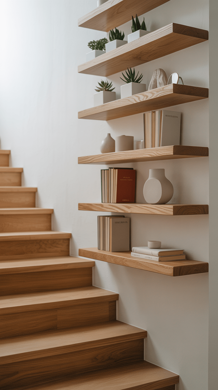 Ein schmales Holzregal an der Treppenwand bietet Platz für Bücher, kleine Dekostücke oder Pflanzen. Es schafft horizontale Linien und unterbricht die vertikale Bewegung der Stufen. Die natürliche Maserung des Holzes wirkt warm und einladend.