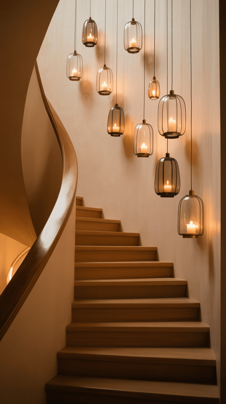 Kerzen auf den Treppenstufen schaffen eine warme Lichtatmosphäre und unterstreichen die Bewegung im Raum. Mit unterschiedlichen Höhen erzeugst du eine sanfte Staffelung. Der flackernde Schein wirkt beruhigend und einladend zugleich.