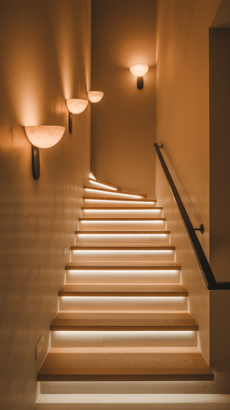 • Zarte LED-Lichterketten für sanfte Linien entlang der Treppe.