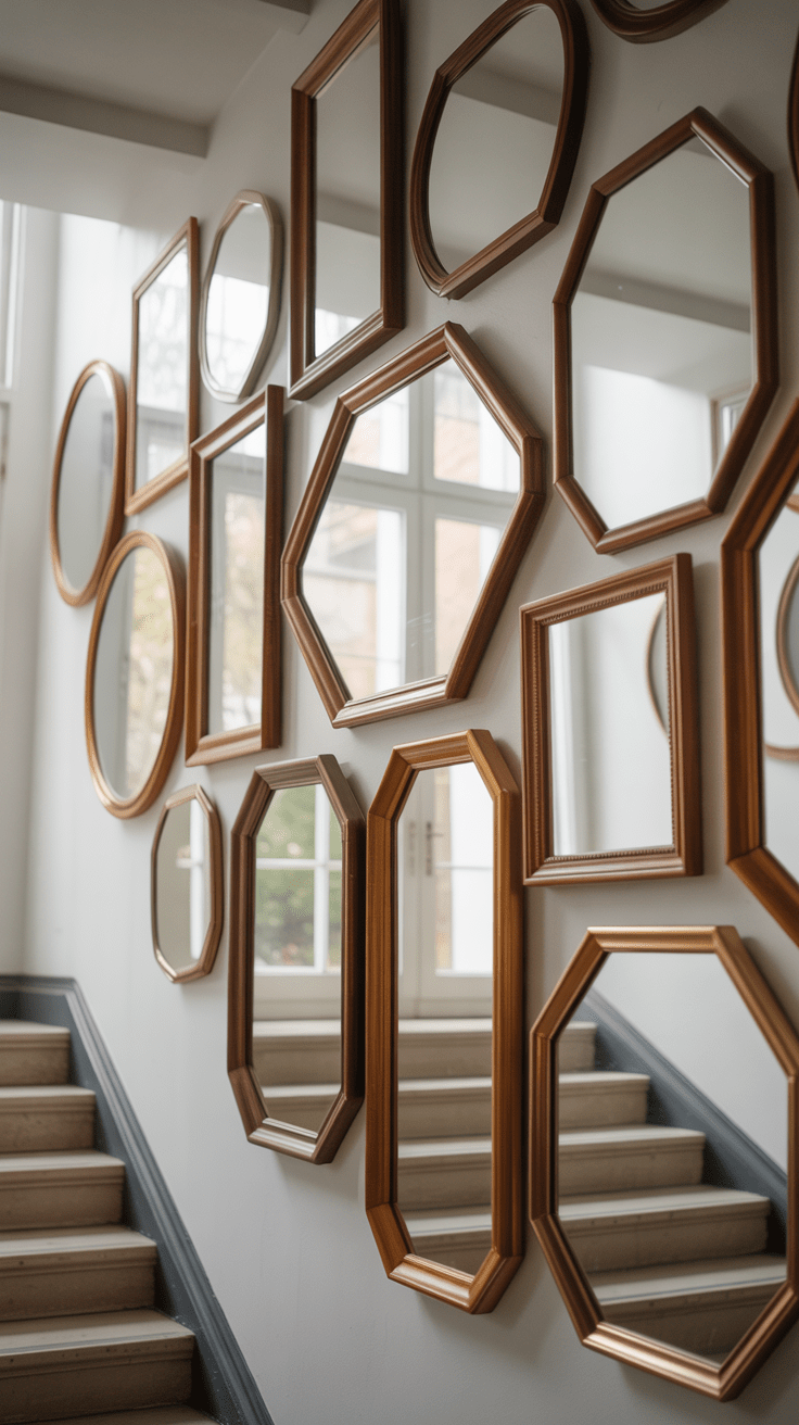 Hänge die Spiegel auf Augenhöhe des mittleren Pods und variiere den Abstand leicht. Arbeite mit verschiedenen Rahmenmaterialien wie Metall, Holz oder Kork für eine lebendige Wirkung. Achte auf sichere Befestigung in tragfähigen Wänden.