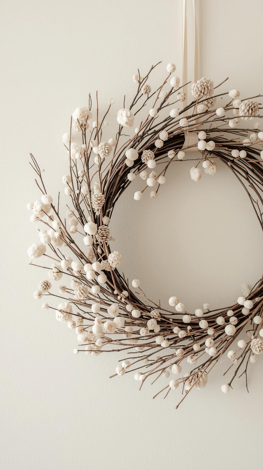 Ein Winterkranz bringt sofort Ruhe in deinen Eingangsbereich oder dein Wohnzimmer. Die Kombination aus Zweigen und weißen Akzenten wirkt soft und klar. Die helle Farbwelt passt zu jeder Einrichtung. Der Kranz ist eine schöne Idee, wenn du Natur und Minimalismus magst.