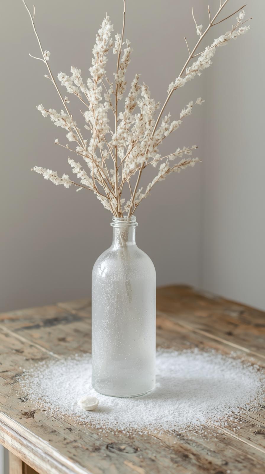 Gefrostete Glasvasen wirken wie eingefroren. Sie bringen einen zarten Winterlook in dein Zuhause. Besonders schön sind sie in Kombination mit weißen Zweigen oder getrockneten Blumen. Diese Idee eignet sich gut, wenn du alte Glasflaschen upcyceln möchtest. Das Ergebnis wirkt modern und sanft zugleich.