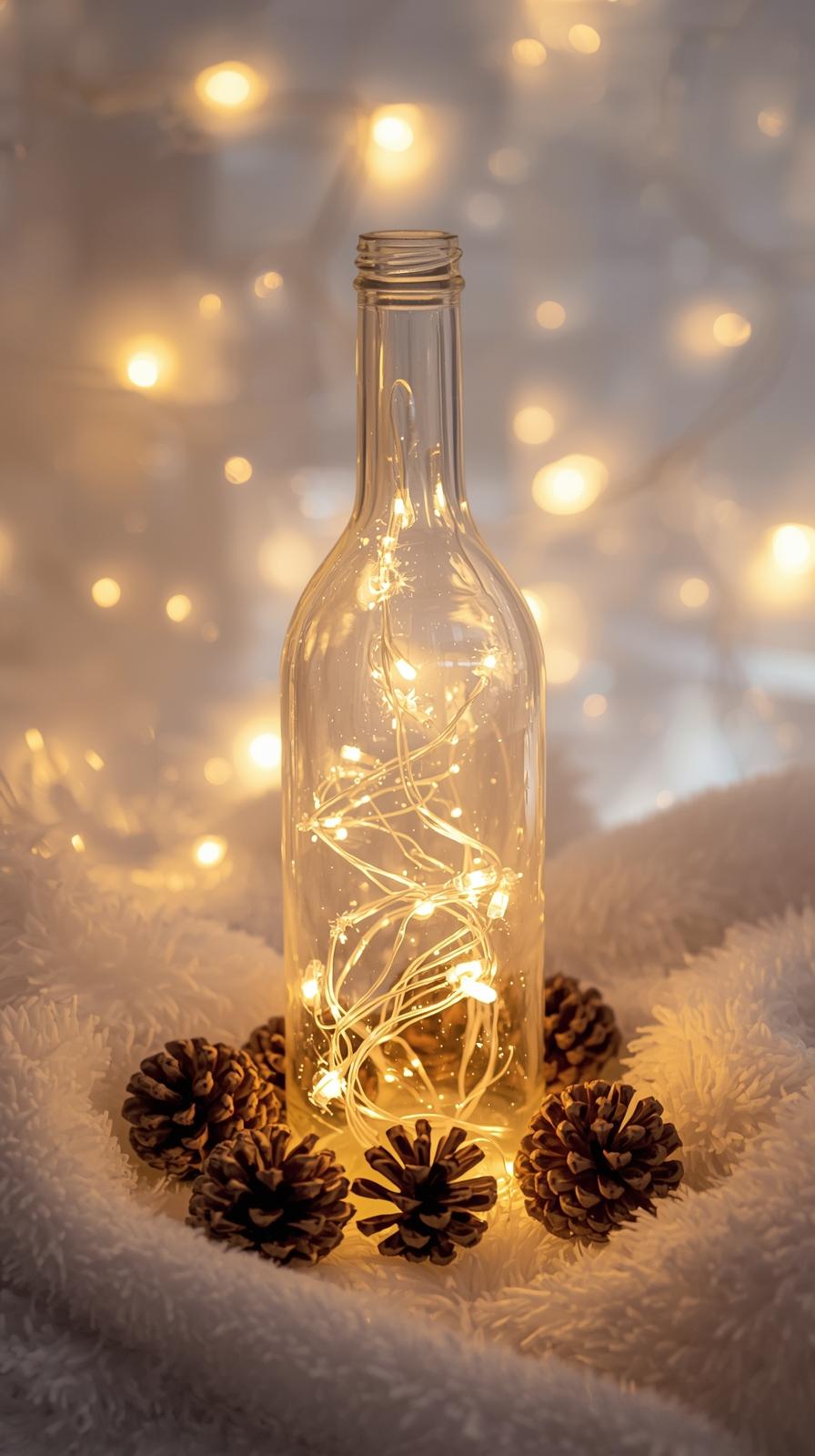 Gefüllte Flaschen mit kleinen Lichtern wirken wie warme Lichtpunkte im Winter. Sie bringen Stimmung in dunkle Ecken und sind schnell gemacht. Diese Deko lässt Räume weicher erscheinen. Besonders schön ist das Lichtspiel auf Glas. Der Effekt ist einfach und sehr gemütlich.